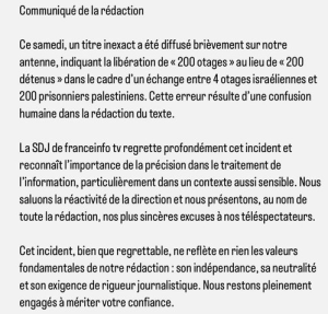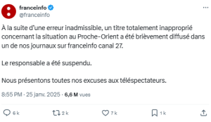 Le 25 janvier, en France, un journaliste a été suspendu par France Info pour avoir utilisé le terme « otages » afin de décrire les 200 Palestiniens libérés par Israël ce jour-là grâce à l’héroïque résilience du peuple de Gaza. Cet incident met en lumière la prégnance du biais médiatique. Le journaliste, qui avait écrit « 200 otages palestiniens retrouvent la liberté », a été immédiatement sanctionné pour avoir enfreint une règle non écrite des médias : le terme « otage » est exclusivement réservé aux Israéliens. France Info s’est empressée de présenter ses excuses dans un tweet :