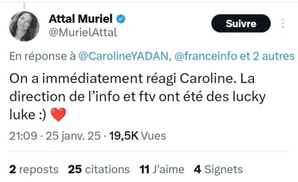 Cependant, ces plates excuses n’ont pas suffi. Caroline Yadan, députée représentant les citoyens français résidant en Israël et avocate inconditionnelle de l’État d’apartheid, a exigé le licenciement du journaliste. Muriel Attal, directrice de la communication de France TV, a promptement confirmé la soumission de la chaîne publique aux pressions venues de Tel-Aviv en tweetant sa réponse :