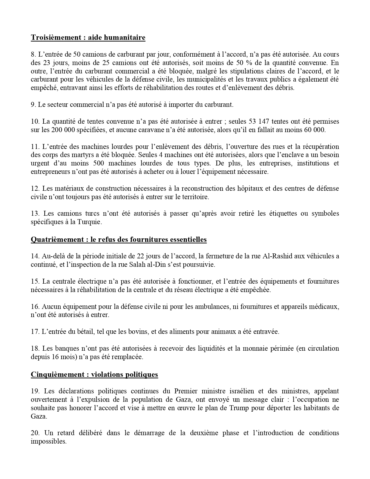 Le rapport se termine sur les « violations politiques », critiquant les déclarations du « Premier ministre israélien et des ministres appelant ouvertement à l’expulsion de la population de Gaza, envoyant un message clair selon lequel l’occupation ne souhaite pas honorer l’accord et cherche à mettre en œuvre le plan de Trump visant à déplacer les habitants de Gaza. » Il dénonce également le « retard délibéré » dans l’ouverture des négociations sur la phase 2 du cessez-le-feu et « l’introduction de conditions impossibles ». [Note : selon plusieurs rapports de la presse israélienne, Netanyahou n’aurait jamais eu l’intention d’aller au-delà de la première phase de l’accord, ayant de toute façon l’intention de reprendre le génocide dès que possible et de déporter la population de Gaza ; ainsi, il ne s’agirait que d’un prétexte, docilement validé par les médias occidentaux, à l’instar des 40 bébés décapités et autres mensonges sur le 7 octobre]