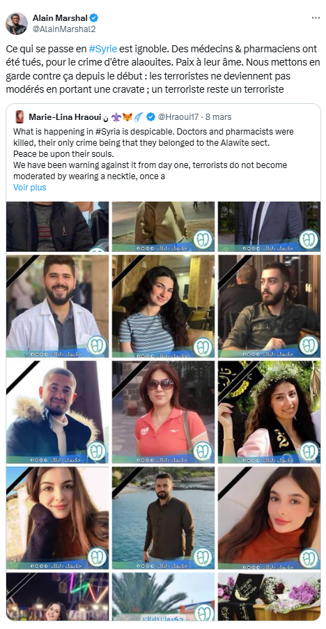 Les réseaux sociaux regorgent de vidéos montrant les atrocités perpétrées ces derniers jours contre des civils alaouites, chiites et chrétiens par les milices du nouveau régime, soutenu par l’Occident « civilisé » et « judéo-chrétien ». Pourtant, nos médias restent discrets sur cette épuration annoncée de longue date, ayant encensé les « rebelles » opposés à Bachar al-Assad malgré leur appartenance à la nébuleuse terroriste Daech. Leur complaisance face aux développements favorables à Israël s’est déjà illustrée dans le traitement abject du génocide à Gaza.