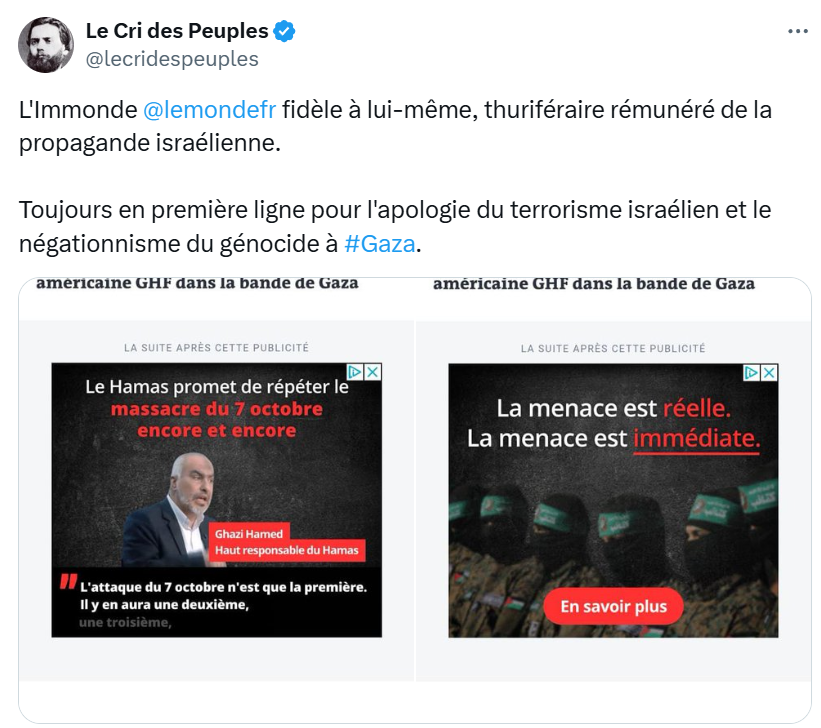 Une telle uniformité dans la couverture médiatique ne traduisait nullement une quelconque réalité : c’était de la pure propagande – une mise en scène narrative servant non seulement les intérêts d’Israël, mais aussi ceux d’une élite politique et médiatique occidentale profondément impliquée dans le génocide israélien.