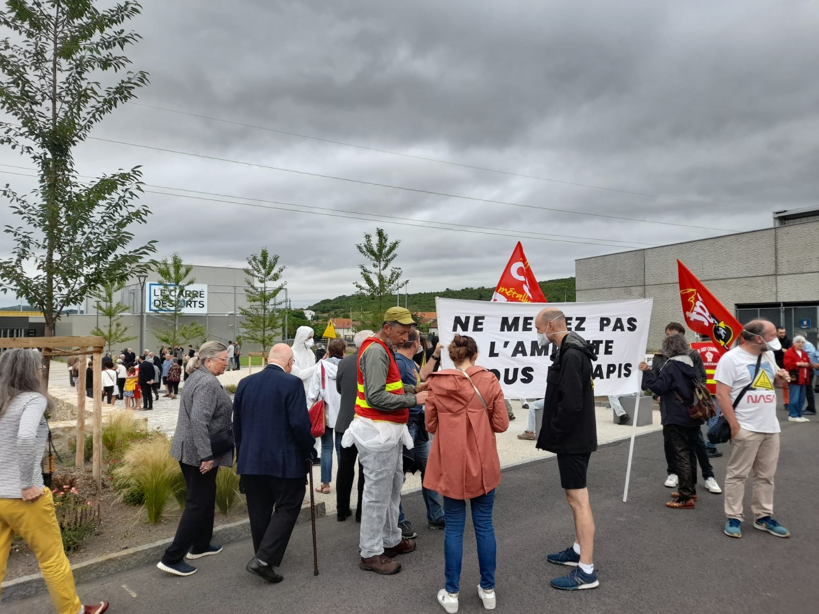 Le point le plus intéressant à mes yeux est ce que dit cet incident du syndicalisme CGT. J’ai fait remarquer au « gorille » que par ses menaces d’intervention musclée en l’absence totale de trouble à l’ordre public, dans une seule volonté de censure, il se mettait sur le même plan que les nervis des forces de l’ordre ou du patronat. Pour ma part, je ne faisais rien d’autre que ce que j’avais fait au sein de la CGT : par exemple, 2 ans plus tôt, le 1er juillet 2023 précisément, je me trouvais justement à un événement festif, affublé du chasuble de la CGT, pour alerter sur la présence d’amiante et ses dangers, les travaux d’un site ayant été effectués sans respecter les règles liées au désamiantage. Les responsables politiques concernés avaient invité tout le gratin local à l’inauguration du parc Hubert Carrerias à Aubière, dans la banlieue de Clermont-Ferrand (Brice Hortefeux, notamment, était présent, comme le rapporte le journal local). Que faisions-nous avec nos banderoles ? Etait-ce une action légitime d’information et de sensibilisation, ou une action de perturbateurs qui n’étaient là que pour « gâcher la fête » ? Etions-nous des militants respectables agissant dans l’intérêt public, ou simplement des « fouteurs de merde » ? Si les organisateurs et/ou invités de l’inauguration pensaient comme le gorille de Montreuil, ils ont eu la décence de ne pas nous le dire, et personne n’est venu entraver notre droit de tracter et de manifester ni nous menacer d’exfiltration forcée.