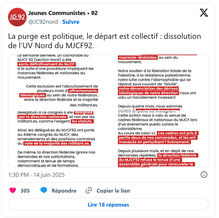 Un autre commentateur ajoutait lucidement que mon affaire « montre que ces événements [le 7 octobre et le génocide à Gaza] vont laisser dans les organisations à gauche des plaies béantes. Elle montre une aliénation profonde des collectifs, qui sont trop perméables au vent bourgeois. A trop se confondre dans les rituels bourgeois et même, leur vision du monde, alors, on en finit par en épouser la violence, la radicalité, jusqu’à l’affolement. » Je ne saurais mieux dire. La lutte des places a bel et bien supplanté la lutte des classes, et la soumission au discours dominant reste un impératif absolu, comme le montre l’exemple de l’implosion du MJCF, principal vivier du PCF, dont la CGT semble épouser les renoncements et la dégénérescence. La scission des Jeunesses communistes du 92 fait justement suite à une purge politique visant à réprimer le soutien à la résistance palestinienne et la lutte contre le racisme (voir ce communiqué). Et à propos d’ « affolement », je reviendrai dans un prochain article sur une action de tractage que j’ai effectuée le 5 juillet à Clermont-Ferrand, à l’issue d’une manifestation organisée par l’AFPS 63, et sur la réaction sidérante de la CGT Educ’action 63, qui est sortie de son mutisme en me surexposant encore à la révocation et à l’inculpation pour « apologie du terrorisme », démontrant une nouvelle fois son absence totale de scrupules.