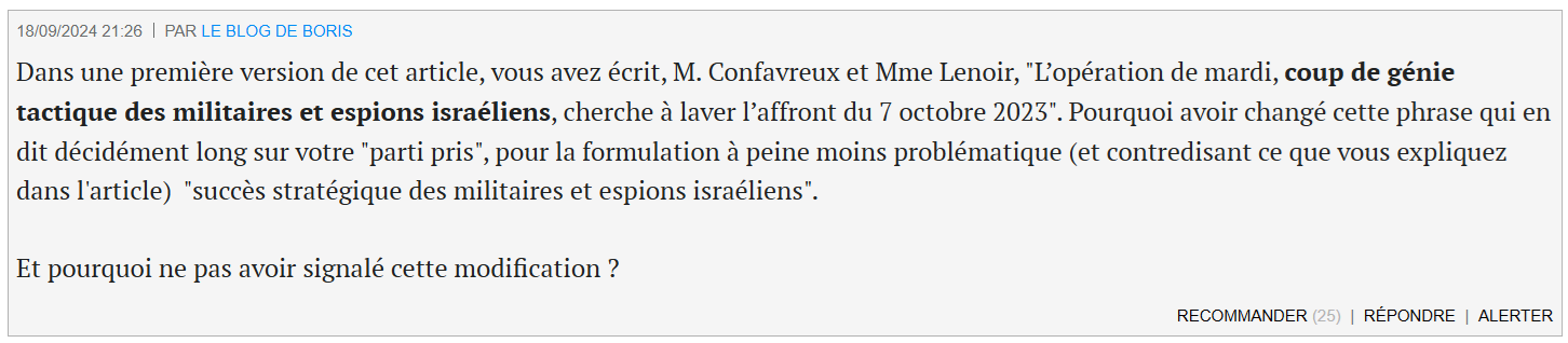 Au sujet de l’attaque terroriste de masse contre les bipeurs et talkie-walkie du Hezbollah, voilà ce que l’on pouvait lire sur cet article de Joseph Confavreux et Gwenaelle Lenoir sur Mediapart, avant que le texte soit édité sans aucune indication aux lecteurs. Qui doute que quiconque qualifierait le 7 octobre « de coup de génie tactique du Hamas » serait non seulement banni de Mediapart pour plusieurs siècles, mais inculpé pour apologie du terrorisme ?