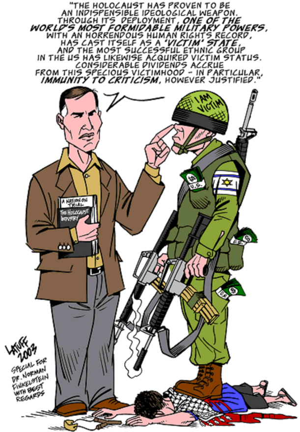 « La Shoah s’est révélée être une arme idéologique indispensable. À travers son utilisation, l’une des puissances militaires les plus redoutables du monde, avec un horrible bilan en matière de droits humains, s’est présentée comme un État-victime, et le groupe ethnique qui a le mieux réussi aux États-Unis a également acquis le statut de victime. D’importants dividendes découlent de cette victimisation fallacieuse — en particulier, l’immunité à la critique, aussi justifiée soit-elle. » Norman Finkelstein, L’Industrie de l’Holocauste : Réflexions sur l’exploitation de la souffrance des Juifs, 2000.