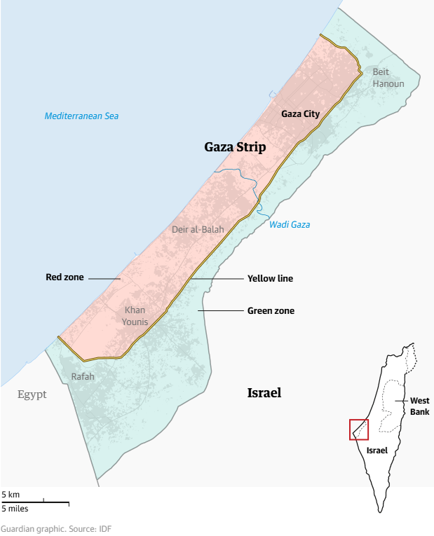 Selon des documents de planification militaire américains consultés par le Guardian et des sources informées des projets américains, des forces étrangères se déploieront d’abord aux côtés des soldats israéliens dans l’est de Gaza, laissant la bande dévastée coupée en deux par l’actuelle « ligne jaune », sous contrôle d’Israël.