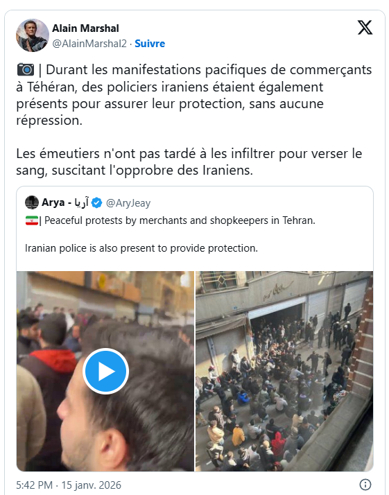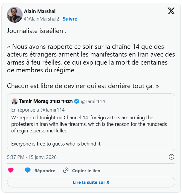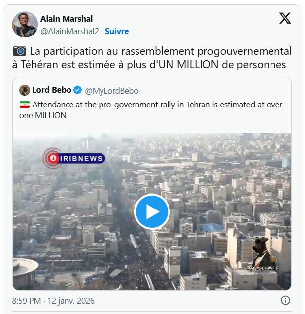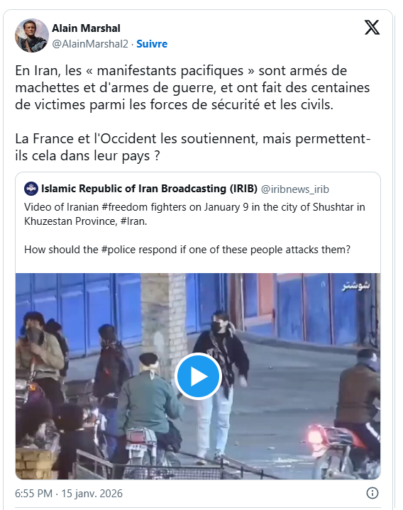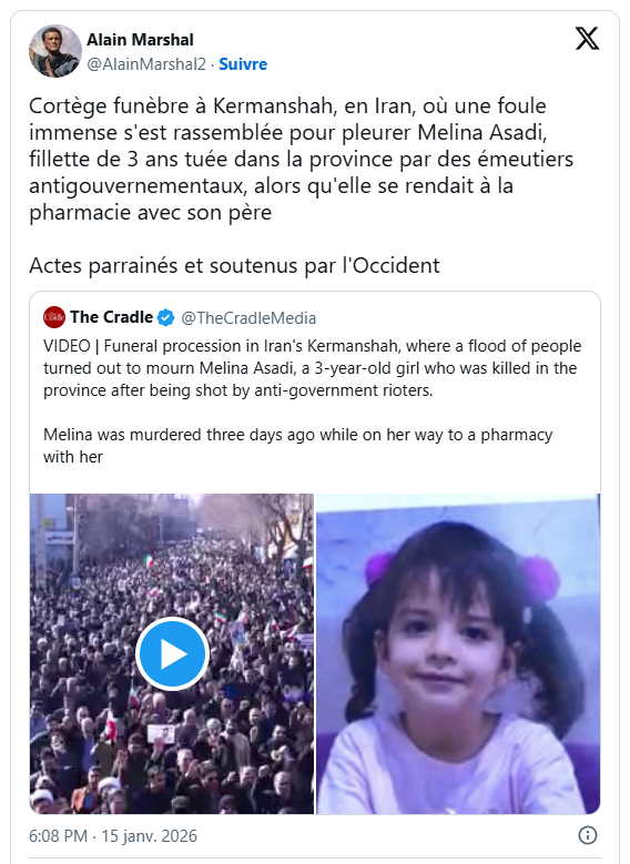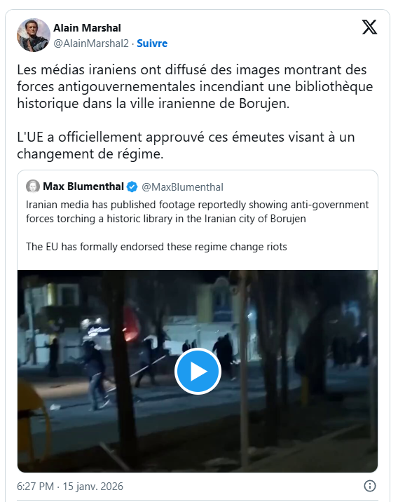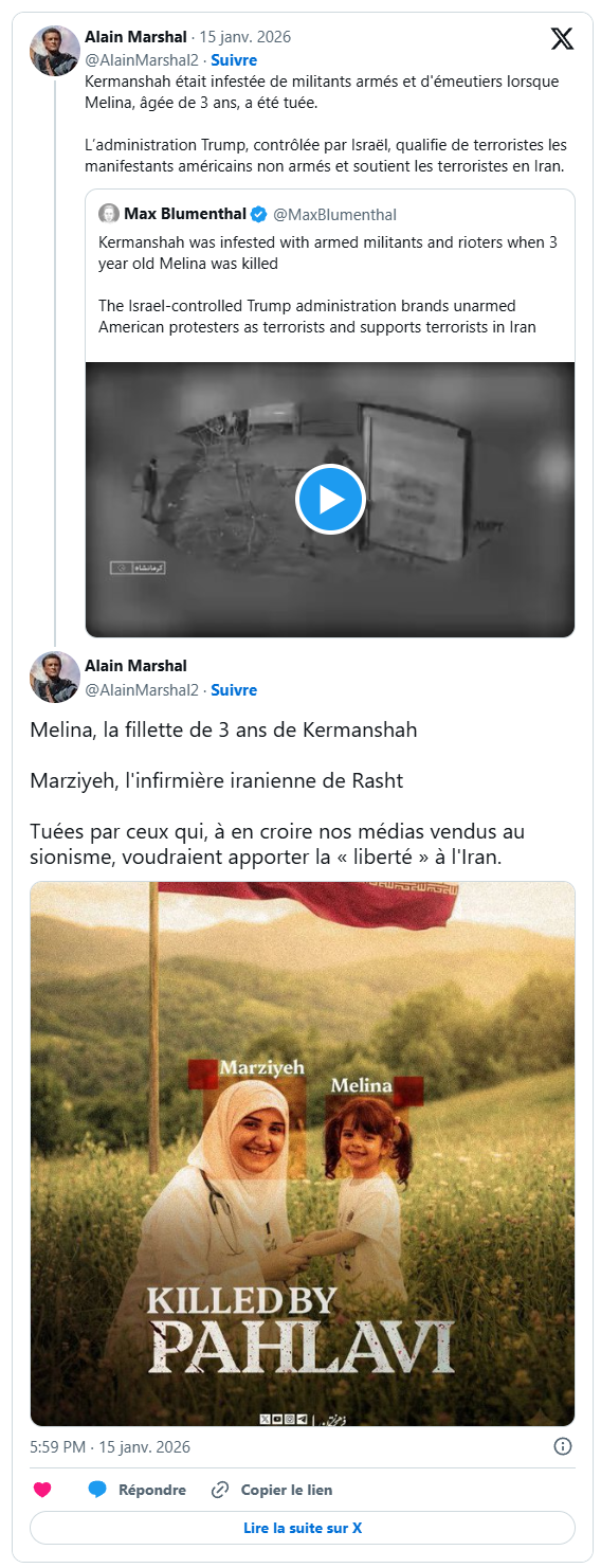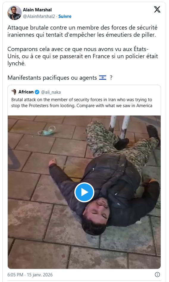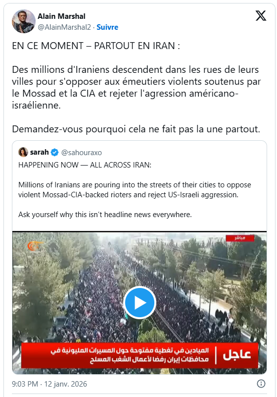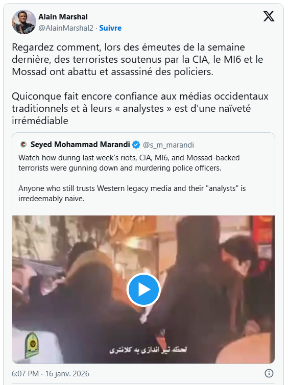 Note d’Alain Marshal : Après avoir activement soutenu la destruction de la Syrie et de la Libye, nos médias s’engagent sans vergogne dans le camp de la destruction de l’Iran (et du Venezuela). Ils méprisent les millions d’Iraniens qui sont descendus dans la rue pour défendre la République islamique, passent sous silence les centaines de policiers et civils tués par les émeutiers armés ouvertement par les Etats-Unis et le Mossad (alors qu’un simple refus d’obtempérer justifie la peine de mort dans leur propre pays), et suramplifient délibérément tant le nombre d’émeutiers que le nombre de victimes des forces de sécurité.