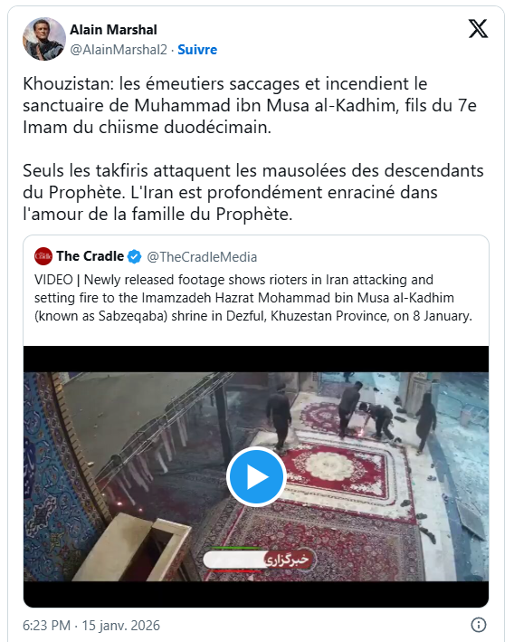 À Téhéran, des foules d’émeutiers ont attaqué la mosquée historique d’Abazar, en incendiant son intérieur, tandis que d’autres ont commis des actes de vandalisme incendiaire et brûlé des exemplaires du Coran à l’intérieur de la Grande Mosquée de Sarableh et du sanctuaire de Muhammad ibn Musa al-Kadhim [le fils du 7e Imam du chiisme duodécimain : seuls les takfiris saccagent les mausolées des descendants du Prophète], au Khouzistan.