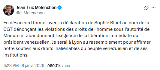 La France insoumise, qui avait réussi à se distancier du discours inepte du « ni Maduro ni Trump » sur le Venezuela et avait dénoncé la position neutraliste de la CGT, reproduit précisément ce travers avec l’Iran, et manifeste une complaisance coupable face au crime sans précédent que constitue l’assassinat d’un dirigeant étranger, servilement qualifié par Mélenchon de « bourreau de son peuple ». Il s’agit pourtant d’une violation encore plus grave que l’enlèvement de Maduro, la Convention de l’ONU de 1973 sur la prévention et la répression des infractions contre les personnes jouissant d’une protection internationale (tels que les chefs d’Etat) définissant comme crime tout acte intentionnel de meurtre, enlèvement ou autre attaque contre la personne ou la liberté d’une telle personne. Ce faisant, Mélenchon reprend la propagande américano-sioniste et balaie d’un revers de main les millions d’Iraniens qui le vénèrent et le considèrent comme leur chef politique et spirituel, leur niant leurs « droits inaliénables » et le respect de leurs institutions.
