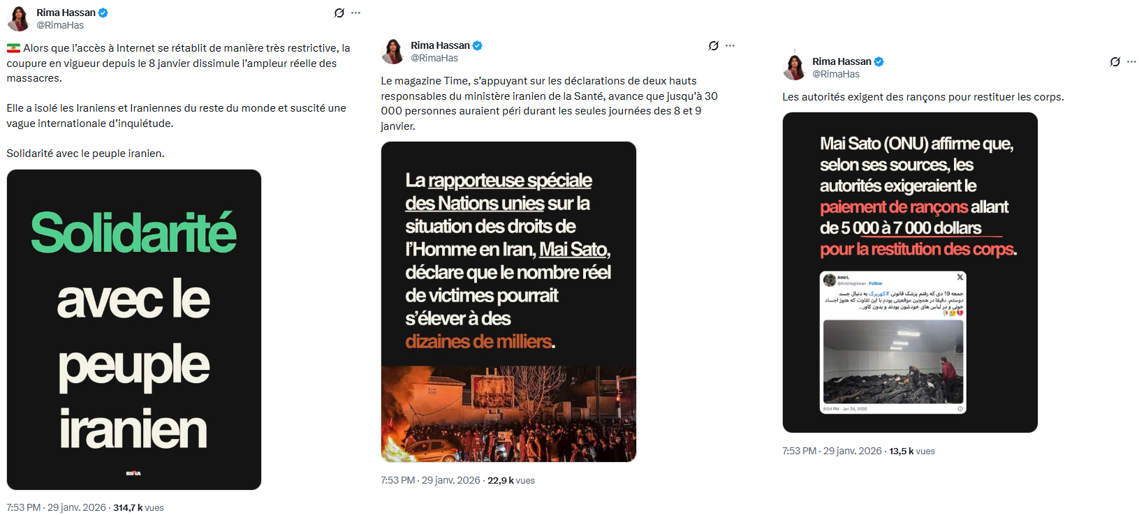 Il est absolument écœurant de constater que plus de deux ans de génocide à Gaza n’ont rien fait pour dissiper l’ignorance crasse, imprégnée de racisme et d’islamophobie, de nos prétendues élites progressistes quant aux réalités du Moyen-Orient. Dès le mois de janvier, lors des émeutes sanglantes en Iran ouvertement soutenues par Israël et les Etats-Unis, qui n’étaient qu’une tentative de « révolution de couleur » (lire Révolution de couleur en Iran : la complicité abjecte des médias occidentaux), LFI a immédiatement validé la propagande atlantiste. Même Rima Hassan, qui est souvent la « voix de la sagesse », combattant les réflexes paternalistes de la gauche, n’a pas jugé nécessaire de mentionner le recours généralisé aux armes blanches et aux armes lourdes chez les « manifestants pacifiques » et le meurtre de centaines de membres des forces de sécurité, et a cautionné le chiffre fantaisiste de 30 000 manifestants tués, alors qu’il a été fabriqué de toutes pièces par une opposante de la diaspora (lire Une ancienne blogueuse de mode et un médecin douteux à l’origine de l’opération psychologique « 30 000 morts » en Iran). Elle a même pris pour argent comptant l’ignoble accusation selon laquelle les familles des victimes devraient payer des rançons pour récupérer les cadavres de leurs proches. Celle-là même qui, à raison, dénonçait la propagande génocidaire sur le 7 octobre, suscitant l’indignation d’un Aymeric Caron, a commis la même faute en calomniant le principal soutien de la Palestine, préparant le terrain à l’agression impérialiste en lui fournissant une justification morale.
