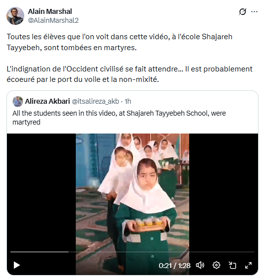 - après avoir ainsi fourni une justification à la guerre d’agression américano-israélienne, le crime suprême selon le Tribunal de Nuremberg, et validé la rhétorique abjecte des criminels contre l’humanité que sont Trump et Netanyahou concernant la prétendue « dictature des mollahs », proclamer, la main sur le cœur, que l’on ne cautionne pas la guerre et dissocier artificiellement les autres victimes de ces frappes, tout en affirmant sa solidarité avec le « peuple iranien » (demander un cessez-le-feu en son nom est bienvenu, à condition de ne pas parler des droits légitimes de l’Iran, qu’il s’agisse du droit de se défendre ou de sanctions contre les agresseurs) ;