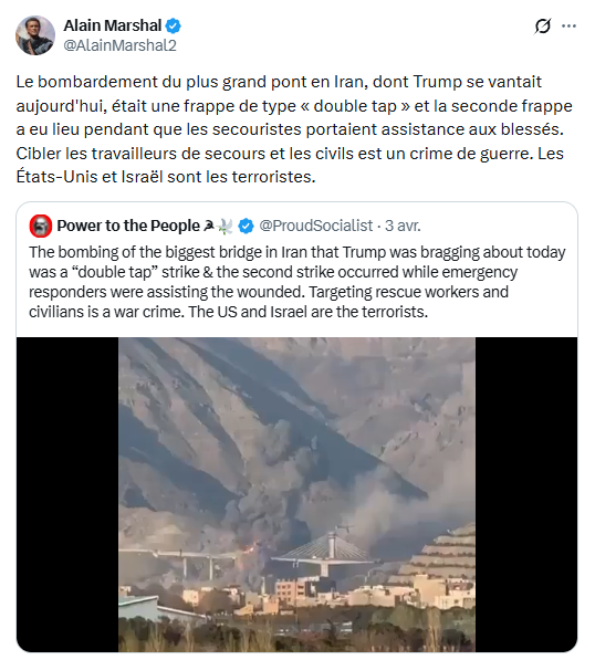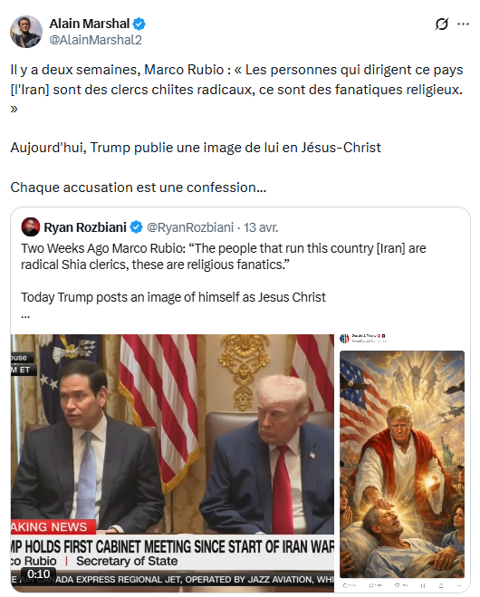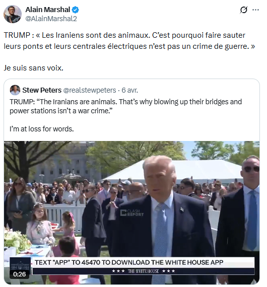 Journaliste : Que pensez-vous toutefois du fait qu’il y ait eu une citation affirmant qu’ils frapperaient des infrastructures énergétiques à l’aide d’une bombe atomique ou raseraient l’Iran ? « Ma réaction honnête est que tout cela me convient. » Donc, ils ont d’abord cité un Iranien qui auraient dit cela.