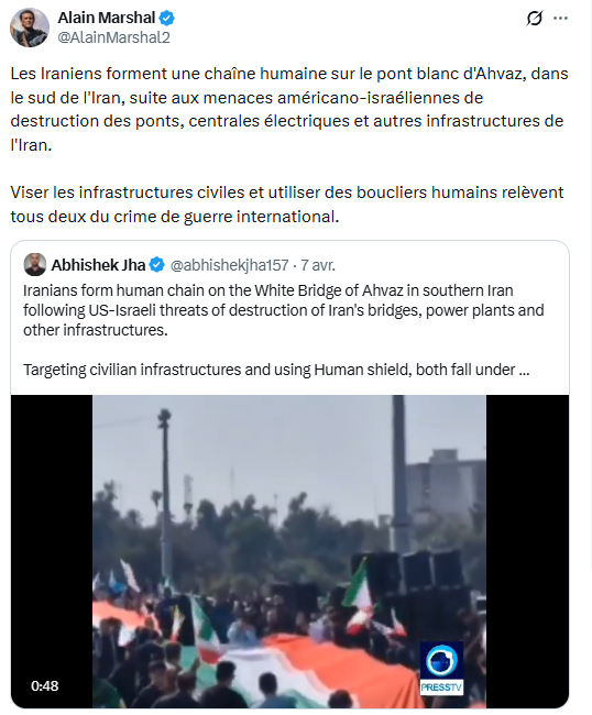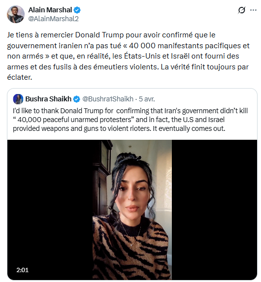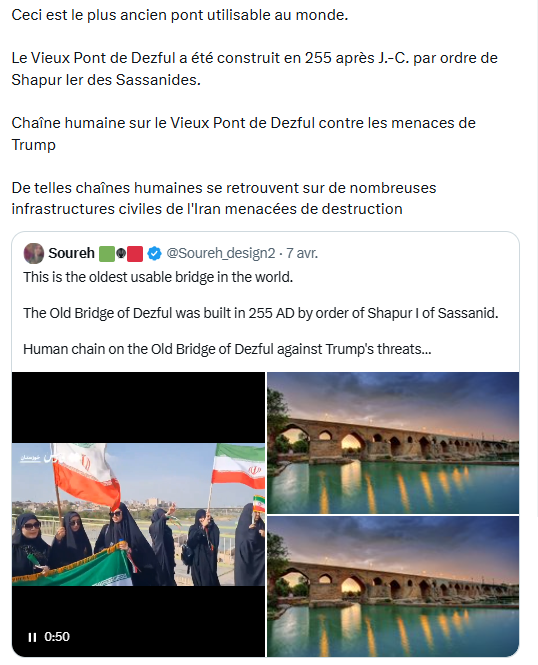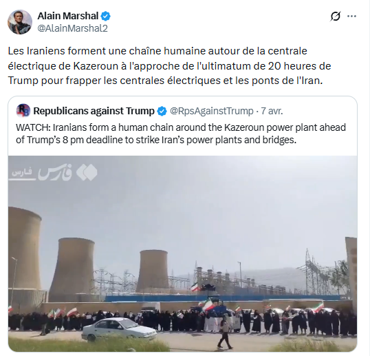 Et donc, les attentes… Vous vous souvenez de cette célèbre phrase de Trump. Non pas qu’il ait des phrases célèbres, vu que c’est un singe attardé, mais citons-le quand même. Il a dit : « C’est votre pays. Levez-vous et prenez-le. » Eh bien, ce n’est pas ce qui s’est passé. Ils se sont mobilisés. Ils se sont mobilisés autour de l’Iran, la civilisation. Vous connaissez cette célèbre phrase de Shakespeare dans Hamlet : « Quelle œuvre d’art que l’homme ! » Il y a des moments dans l’humanité où l’on assiste à des moments de sublimité, de grandeur, de véritable courage et de caractère humains. Et ces scènes où les Iraniens se rassemblent en masse autour de leurs ponts, les ponts de leur civilisation, autour des centrales électriques, des sources d’énergie de leur civilisation.