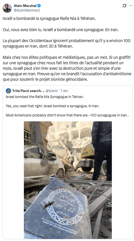 Oh, je dois dire que ça va poser un gros problème à Trump vis-à-vis de Netanyahou, car, vous savez, le premier réflexe de tout le monde est de rejeter la faute sur quelqu’un d’autre. Et dans son esprit, Netanyahou l’a induit en erreur. Netanyahou avait tort. Il l’a induit en erreur. « Tu as dit que ce serait du gâteau. Tu as dit que l’Iran serait au bord du gouffre. Tu as dit que le peuple allait se soulever. Tu as dit que tous tes agents étaient déployés partout en Iran, prêts pour une insurrection populaire. Eh bien, ça ne s’est pas produit. »