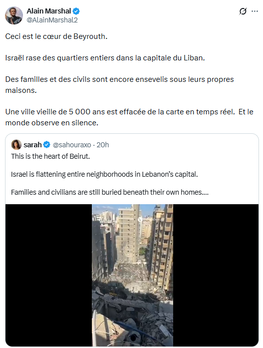 Cependant — ce n’est pas vraiment « cependant », c’est un « en plus ». Je ne veux pas dire « cependant ». Ce droit, et je dirais cette responsabilité, de venir à la défense de l’Iran contre les bêtes sauvages, cela me semble clair comme de l’eau de roche, mais il y a une considération politique : si vous faites cela, le Liban allait être détruit, et ils le savaient. Il allait être détruit. Pendant le génocide israélien à Gaza, Sayed Nasrallah, le Secrétaire général du Hezbollah, a désespérément essayé de tracer une voie médiane. Il voulait défendre — et je crois que c’était sincère, ce n’était pas seulement un calcul stratégique —, il voulait défendre la population de Gaza contre l’attaque génocidaire, mais il savait que s’il allait ne serait-ce qu’un peu trop loin, le Liban serait rasé. Il a essayé de tracer cette voie médiane. Cela n’a pas fonctionné. Il n’a pas réussi à la trouver. C’était un brillant tacticien militaire et un acteur politique profondément sérieux. Probablement, à mon avis, l’acteur politique le plus sérieux sur la scène mondiale à ce moment-là. Et il se trouvait face à un dilemme impossible.