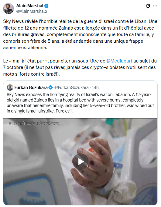 Au moins les Allemands sous le régime nazi, eux, avaient l’alibi. C’était en grande partie faux, mais ils avaient l’alibi. Ils ne savaient pas que la « solution finale » se déroulait derrière les murs des camps de concentration et des camps d’extermination. Ils pouvaient dire : « Nous vivons dans un pays totalitaire et nous n’avons pas d’informations alternatives », pour reprendre une expression d’aujourd’hui. Ils n’auraient pas utilisé cette expression. Oui. Mais ils en savaient assez. Vous savez, 50 % des Juifs qui ont été exterminés l’ont été sur le champ de bataille. Ils ont été alignés et abattus. C’est ainsi qu’ils ont été tués. 50 % ont été tués dans les camps d’extermination, dans les camps de concentration, mais 50 % ont été alignés et abattus. Les soldats le savaient. Mais Israël n’a même pas cet alibi. En fait, ils publient sur les réseaux sociaux ce qu’ils font. Une nation complètement folle.