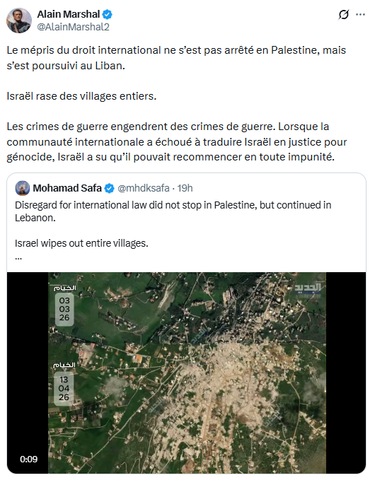 Cela va donc mener à la destruction du Liban, parce que maintenant ce sont les Israéliens fous qui s’en prennent aux autres parce qu’ils sont enragés. Leur chef, un maniaque meurtrier, n’a pas obtenu ce qu’il voulait. Donc, cela va être difficile pour le Liban. Et je ne vais en aucun cas nier la colère des Libanais envers le Hezbollah. Ils ont le droit de vivre et ils ne voulaient pas sacrifier leur vie pour l’Iran. Ils ne l’ont pas fait. Je veux dire la partie de la population qui n’appartient pas au Hezbollah. Ils ne l’ont pas fait. Et ils ont le droit de ne pas vouloir le faire. Mais d’un autre côté, le Hezbollah avait le droit, et on pourrait dire la responsabilité, de venir au secours — c’est-à-dire à l’aide — d’un pays qui avait été attaqué par des bêtes sauvages qui ont ensuite déclaré qu’elles allaient mettre fin à la civilisation iranienne. [note : nous sommes en total désaccord. Le Hezbollah ne s’est pas contenté de « venir en aide à l’Iran » : il a finalement riposté après 15 mois de violations israéliennes du cessez-le-feu de novembre 2024, afin de défendre la souveraineté et la sécurité du Liban. La confrontation était inévitable, et mieux valait riposter aux côtés de l’Iran plutôt que seul ; de plus, le Hezbollah a devancé une offensive israélienne, comme en 2006. Enfin, la destruction totale par Israël des capacités de la Syrie et l’occupation de territoires plus vastes après la chute d’Assad prouvent qu’il n’existe aucun refuge sûr contre ce « chien enragé », déterminé à détruire tous les pays qui l’entourent — même ceux qui lui sont « amis » — afin de mener à bien le projet du « Grand Israël ». De plus en plus de Libanais le comprennent, même en dehors de la base du Hezbollah. Les chiites constituent la plus grande communauté du Liban, et l’alliance Hezbollah-Amal est la principale force politique du pays. Voir le discours de Naïm Qassem consacré à cette question, en particulier les sections « 15 mois d’agression israélienne » et « Le Hezbollah est sur la défensive ».]