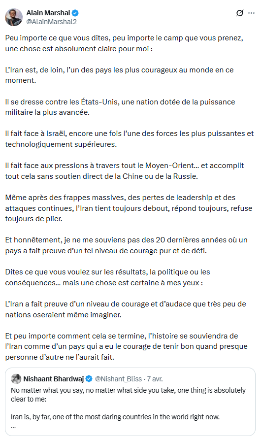 D’un autre côté, l’Iran a déclaré qu’il n’ouvrirait pas le détroit d’Ormuz tant qu’il ne serait pas certain qu’il n’y aurait pas de nouvelle attaque dans les quelques semaines suivant la reprise de forces ou la préparation d’une nouvelle offensive par Israël et les États-Unis, et qu’il n’ouvrirait pas le détroit d’Ormuz en échange d’un cessez-le-feu [note : le détroit d’Ormuz reste fermé : le passage nécessite une autorisation et un paiement, qui ne seront accordés ni aux navires américano-israéliens ni à leurs alliés]. Ils voulaient un règlement final solide, ce qu’ils n’ont clairement pas obtenu. On a souvent dit que tout ce que l’Iran avait à faire pour gagner était de ne pas perdre, et ils n’ont pas perdu. À ce niveau-là, on peut donc affirmer qu’ils ont gagné.